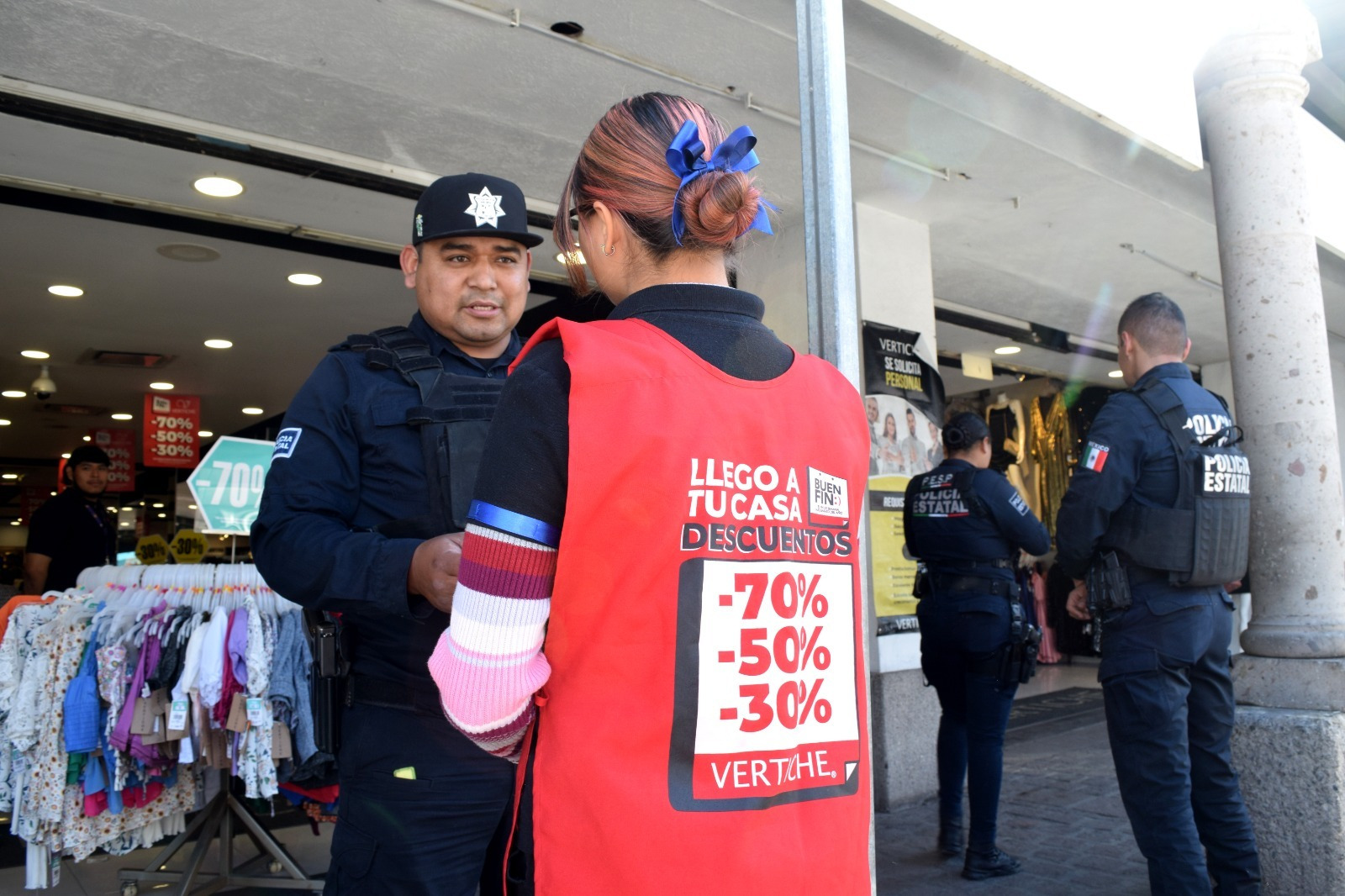 Desde esta mañana se reforzó la presencia a pie de mujeres y hombres de la Policía Estatal de Seguridad Pública (PESP) en plazas, comercios y zonas bancarias para atender a la ciudadanía que se prepara para las compras, esto como parte de la coordinación que se mantendrá con autoridades de los tres niveles de gobierno.