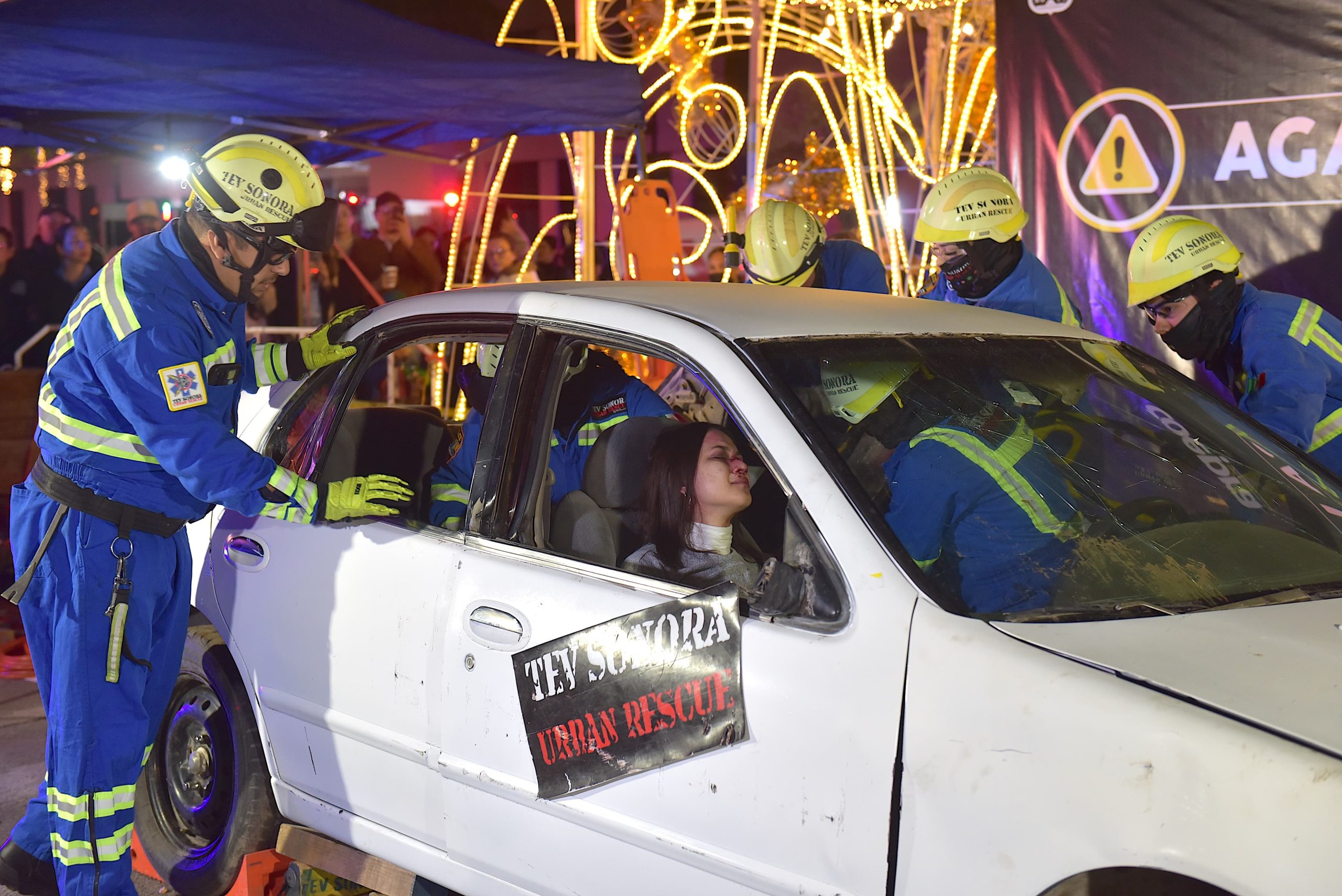 Como parte del programa Agarra La Onda de Tránsito Municipal, se realizó una demostración de rescate en un vehículo con más de cinco elementos de TEV Sonora Urban Rescue quienes utilizan diversas herramientas para extraer a personas atrapadas.