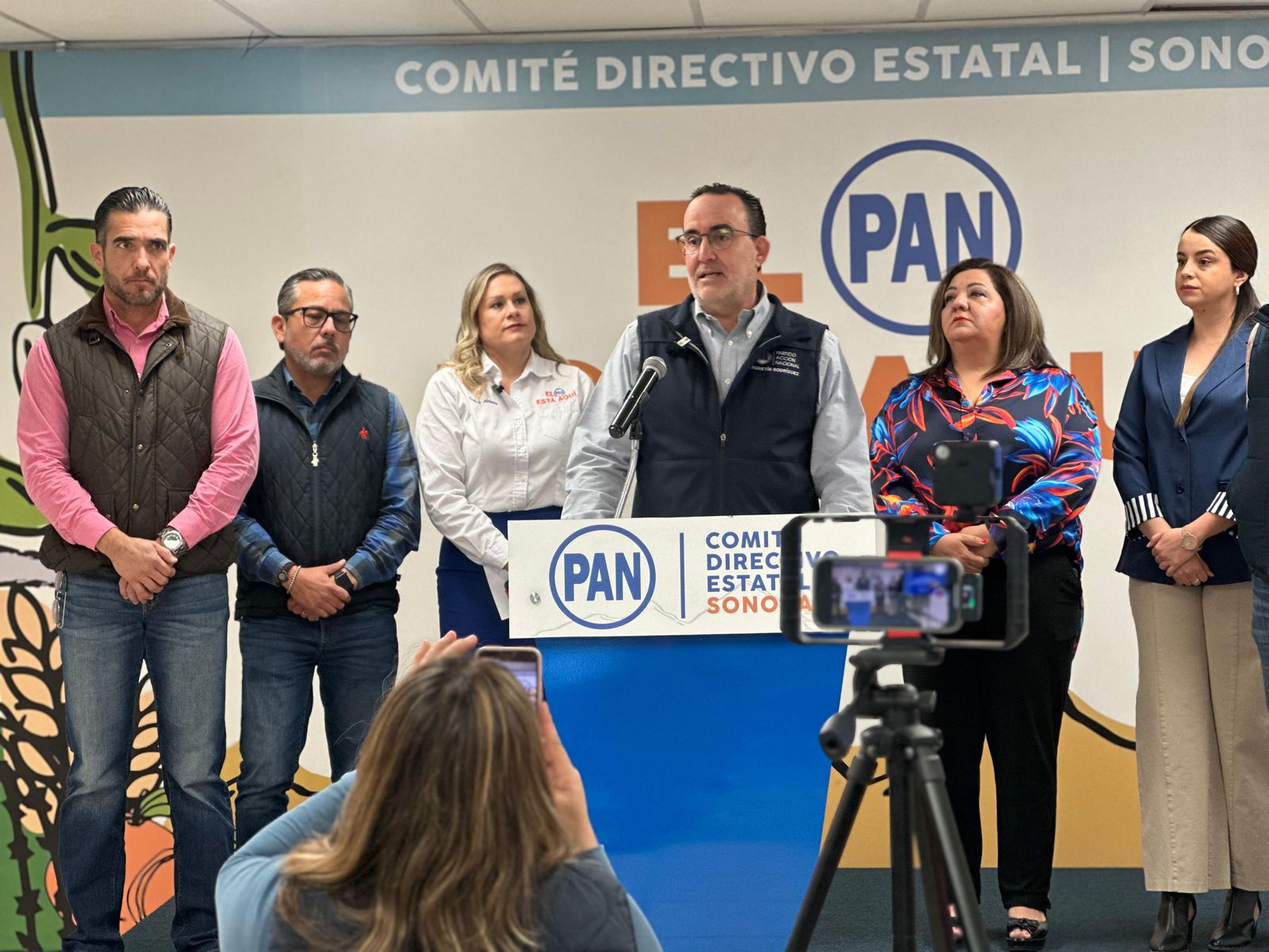 Al diputado federal Agustín Rodríguez Torres lo acompañó en la conferencia de prensa la secretaria general del PAN Sonora, Celina Aldana, así como las y los secretarios del CDE, la secretaria general adjunta, María Carmela Estrella, Viviana Miranda, directora de Fortalecimiento interno, el secretario de Fortalecimiento Interno, Alberto Carlos Castro, el secretaria de Formación y Capacitación, Aldo Armando Figueroa y el secretario de Acción Electoral, Jesús Manuel Enríquez.