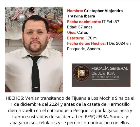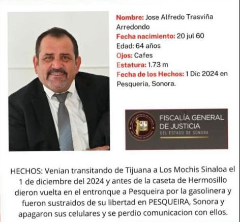 Hermosillo, Sonora a 11 de diciembre de 2024.- Padre e hijo que viajaban desde el vecino país del Norte a pasar las fechas decembrinas con sus familiares en Sinaloa, fueron reportados como desaparecidos presuntamente luego de ser privado de su libertad por civiles armados.