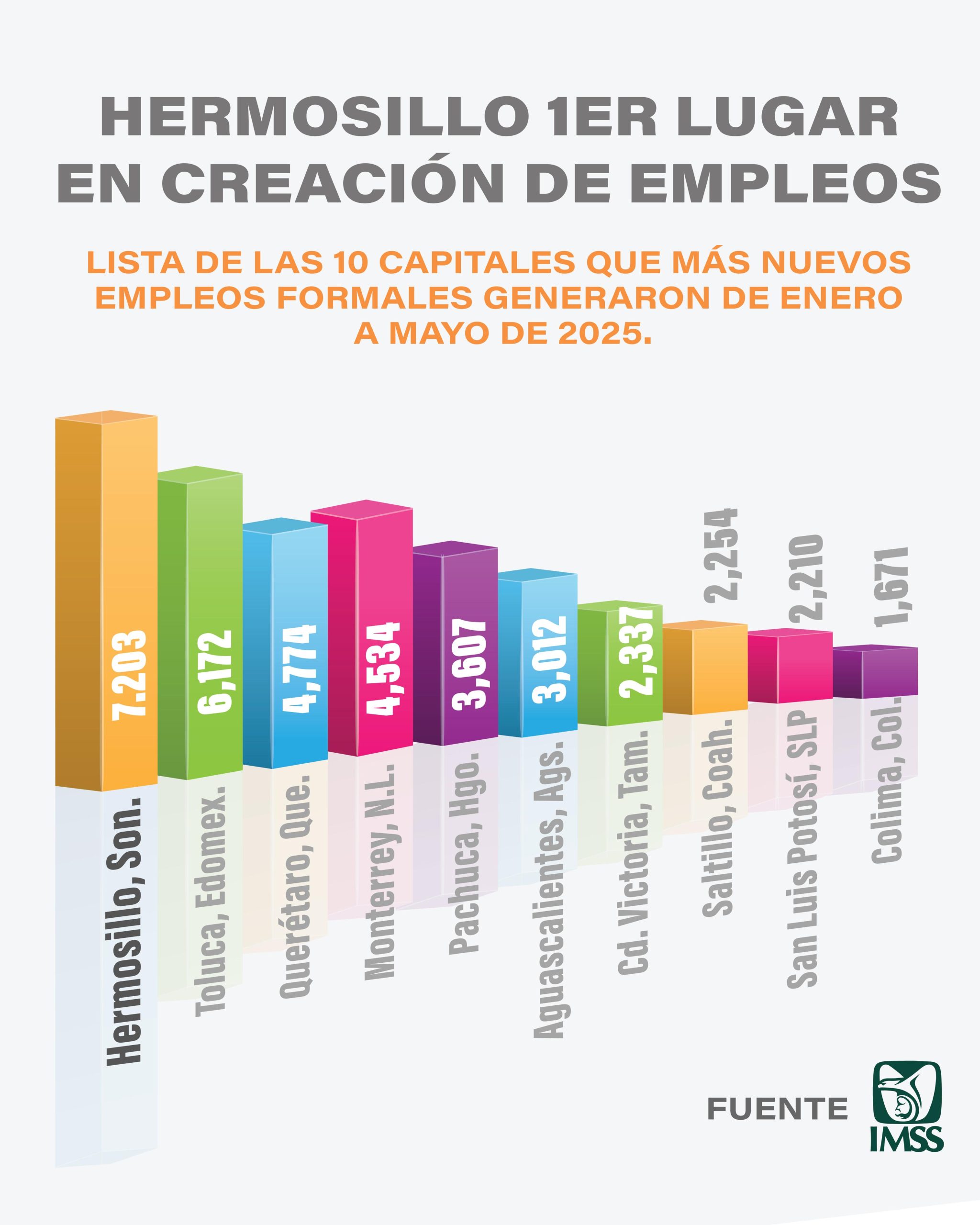 Con 7 mil 203 empleos desde enero a mayo del 2025, Hermosillo encabeza la lista de las diez capitales con mayor generación de empleos de acuerdo al IMSS