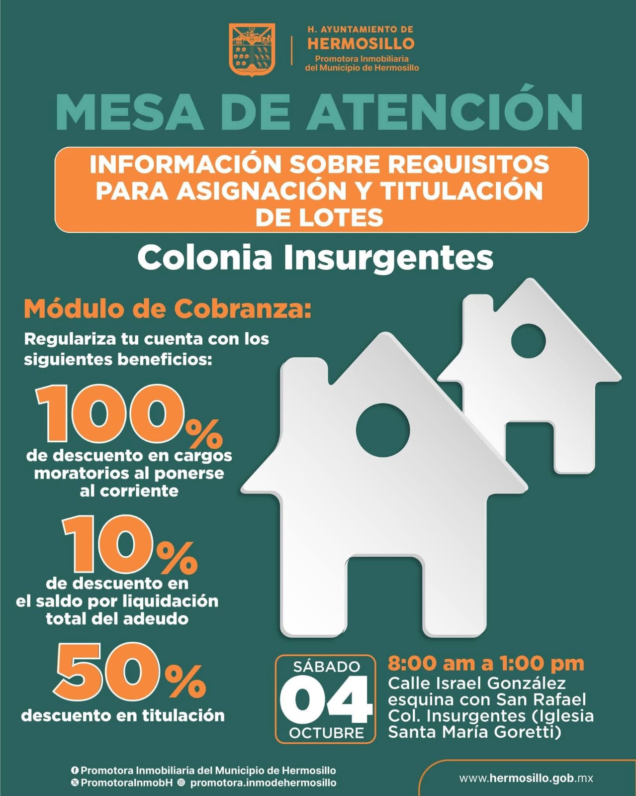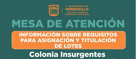 Hermosillo, Sonora a 01 de octubre de 2025.- El Ayuntamiento de Hermosillo, mediante la Promotora Inmobiliaria del Municipio, instalará este sábado 4 de octubre una mesa de atención en la colonia Insurgentes, para recibir predios e informar sobre los requisitos de asignación y titulación de lotes.