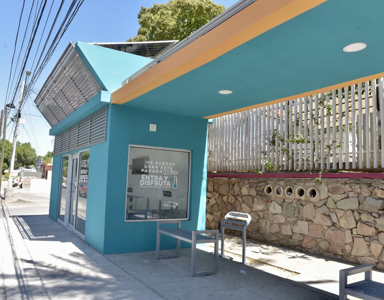 Hermosillo, Sonora a 05 de octubre, 2025.- Beneficios como videovigilancia 24/7, refrigeración, internet wifi, visualización de rutas en tiempo real, módulos de recarga de teléfonos móviles, entre otros beneficios cuentan las paradas funcionando del Gobierno de Hermosillo.