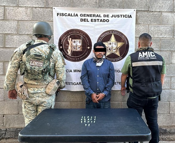 Hermosillo, Sonora a 06 de octubre de 2025.- La Fiscalía General de Justicia del Estado de Sonora (FGJES), en una acción coordinada por medio de la Agencia Ministerial de Investigación Criminal (AMIC), con la Secretaría de la Defensa Nacional (DEFENSA), logró la detención de un hombre y el aseguramiento de narcóticos tras la ejecución de una orden de cateo en la colonia Amapolas.