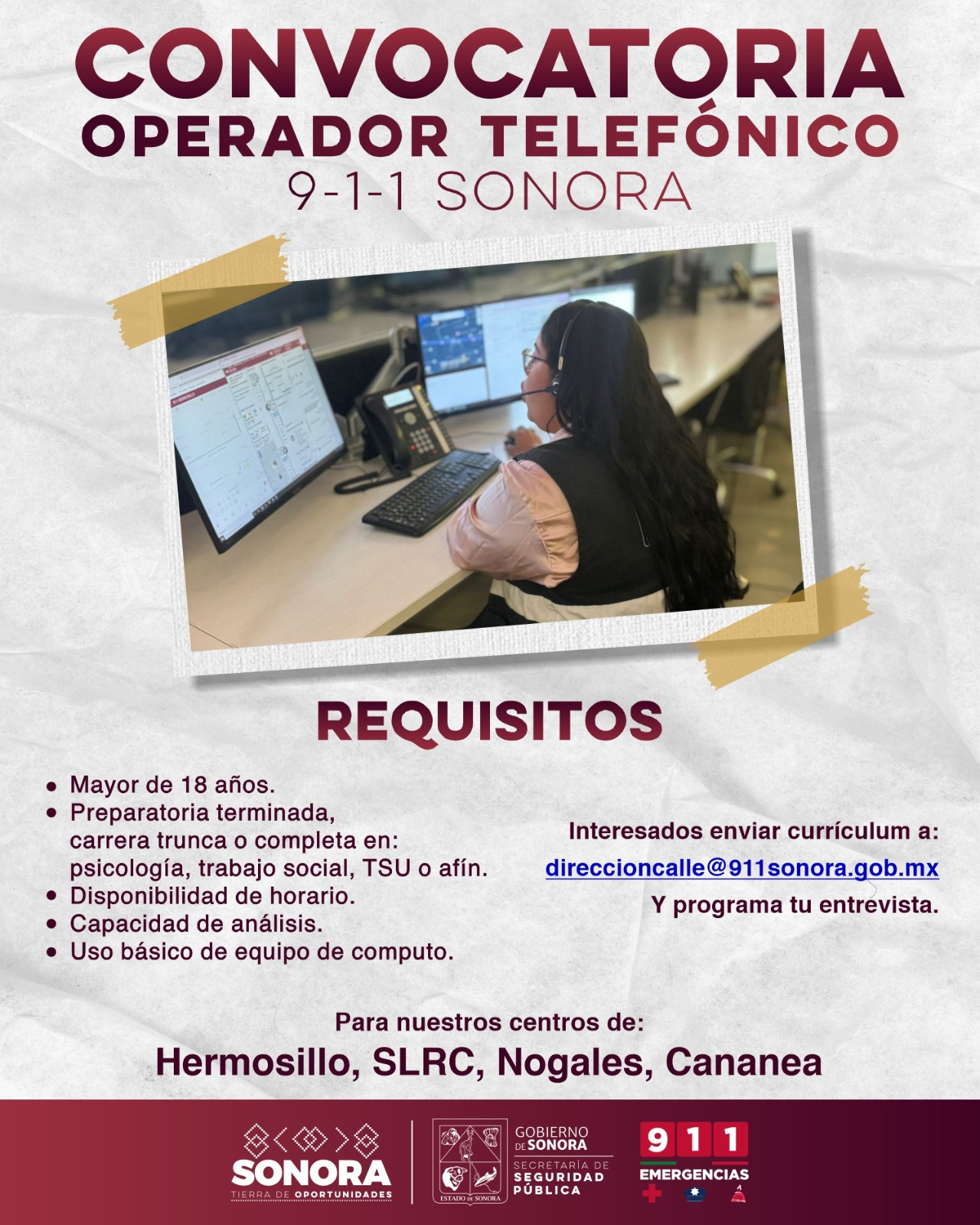 San Luis Río Colorado, Sonora a 06 de octubre de 2025.- Para fortalecer la atención que el Gobierno de Sonora brinda a la ciudadanía que reporta emergencias, la Secretaría de Seguridad Pública (SSP) anunció que ofrece opciones de empleo como Operadores Telefónicos de la Línea 9-1-1 en Hermosillo, San Luis Río Colorado, Nogales y Cananea.