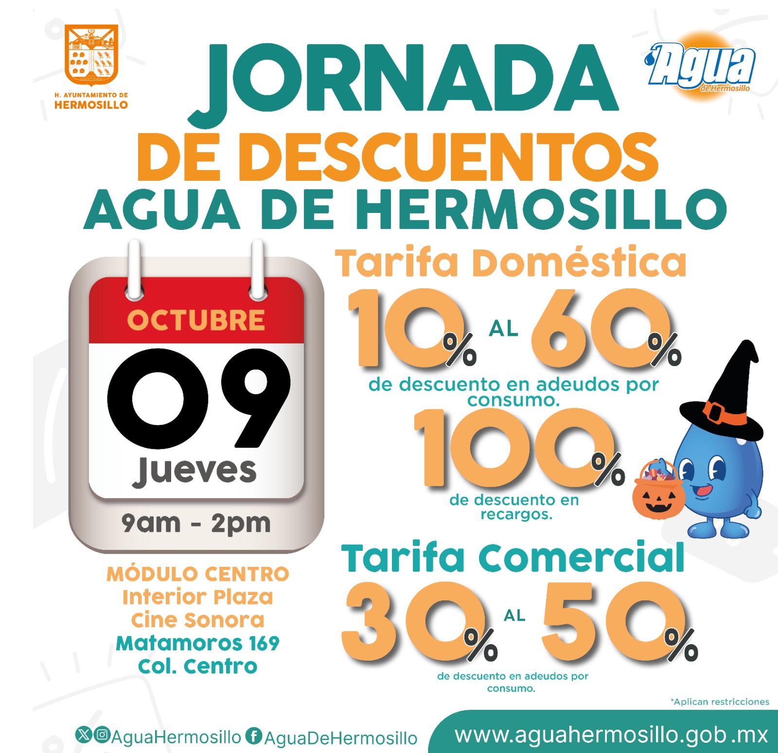 Hermosillo, Sonora a 08 de octubre de 2025 .- Agua de Hermosillo convoca a sus usuarios a participar en la Jornada de Descuentos que se llevará a cabo el jueves 09 de octubre, en el Módulo Centro Interior Plaza Cine Sonora, en un horario de 9:00 a.m. a 2:00 p.m.