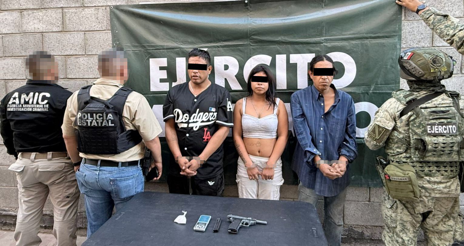 Durante la intervención, fueron asegurados Yareli Guadalupe “N”, de 18 años; Ángel Orlando “N”, de 29 años; y Luis Alonso “N”, de 39 años, todos con antecedentes penales relacionados con delitos de narcomenudeo, violencia familiar, lesiones y conducción punible de vehículos.