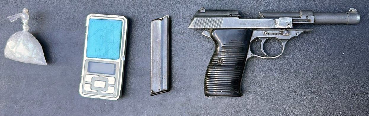 En el lugar se localizaron y aseguraron, por personal de Servicios Periciales, los siguientes indicios: Una pistola calibre .22, una bolsa de plástico con sustancia similar al narcótico conocido como “cristal” y una báscula gramera color gris