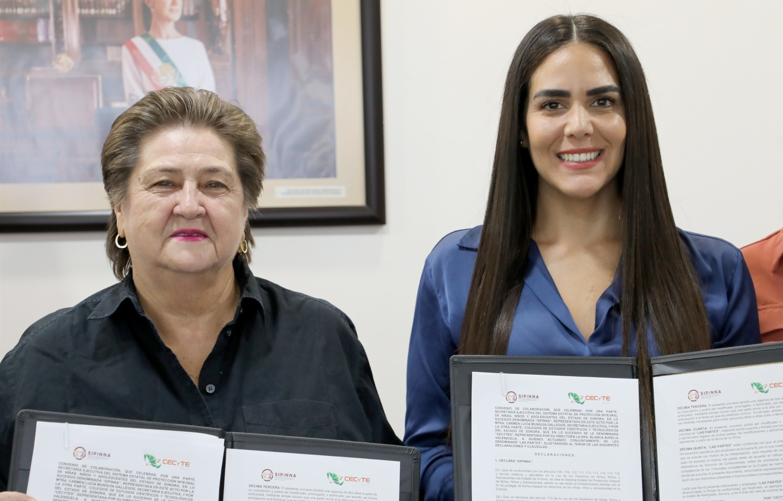 La directora general de Cecyte Sonora, Blanca Aurelia Valenzuela y la secretaria Ejecutiva de Sipinna, Carmen Lucía Munguía Gallegos, firmaron un convenio de colaboración con el objetivo de establecer una cooperación estratégica para llevar a cabo actividades conjuntas de capacitación, difusión y formación, dirigidas tanto a estudiantes, personal docente y administrativo del subsistema, así como a la comunidad en general.