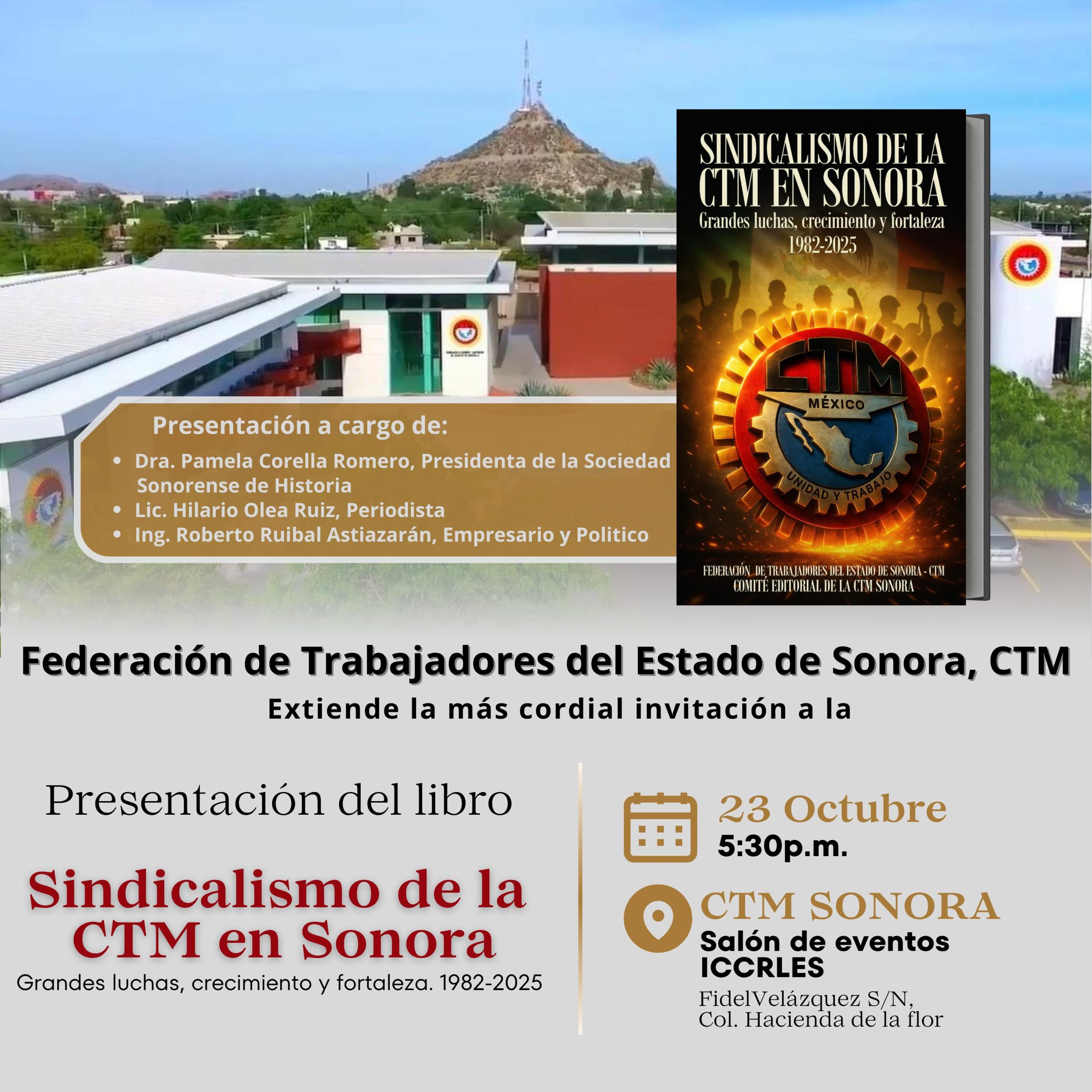 La cita es el próximo jueves 23 de octubre a las 17:30 horas, en el Salón de Eventos del Instituto de Capacitación CTM, ubicado en Fidel Velázquez s/n, Colonia Hacienda de la Flor, en Hermosillo, Sonora.