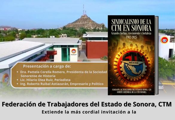 Hermosillo,Sonora a 20 de octubre de 2025.- La Confederación de Trabajadores de México (CTM) en Sonora presentará la obra “Sindicalismo de la CTM en Sonora. Grandes luchas, crecimiento y fortaleza. 1982–2025”, un testimonio del papel que el movimiento obrero ha desempeñado en el desarrollo económico y social de la entidad.