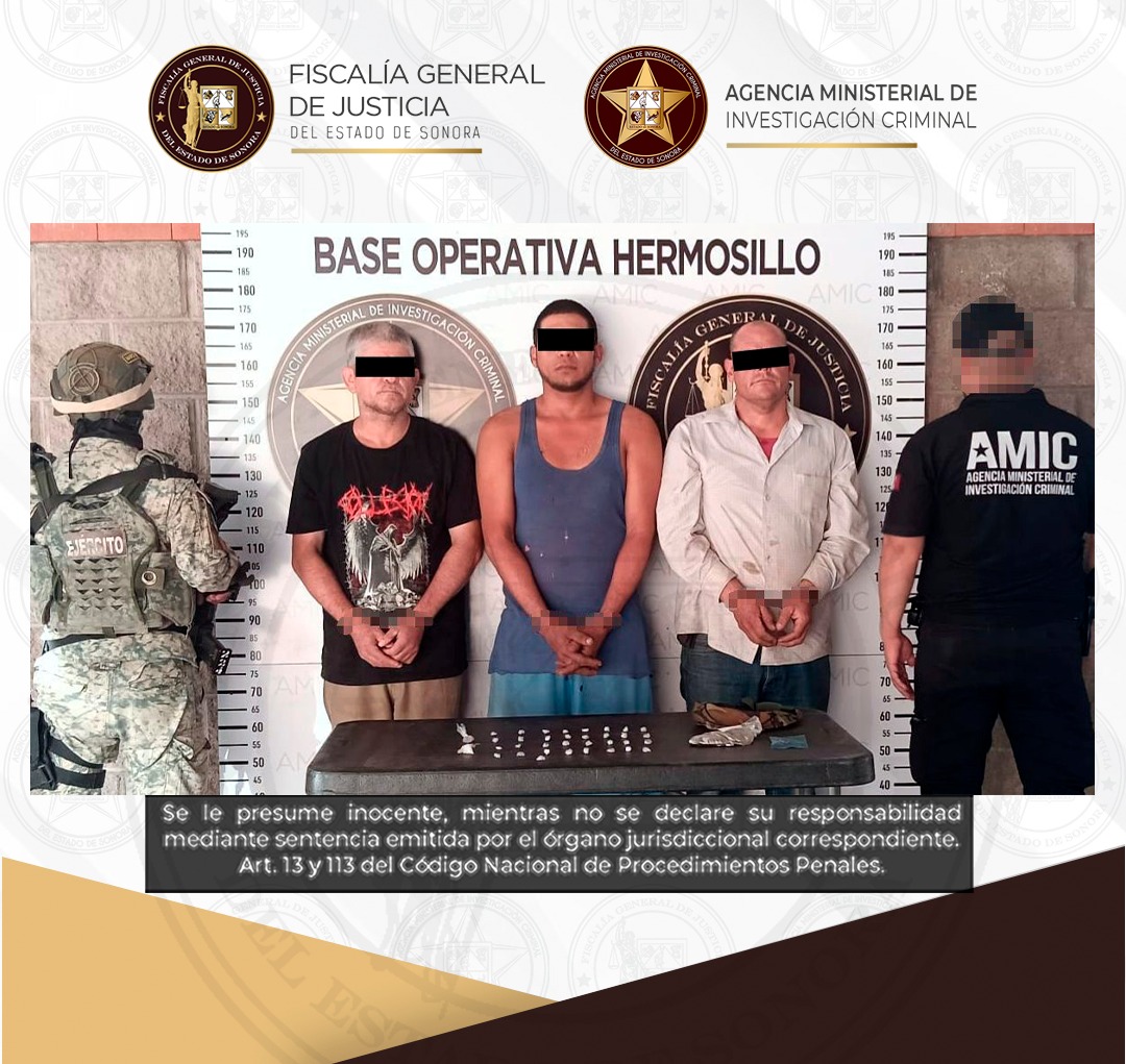 Hermosillo, Sonora a 13 de noviembre de 2025.- Un operativo conjunto entre la Agencia Ministerial de Investigación Criminal (AMIC) y la Secretaría de la Defensa Nacional (DEFENSA) permitió el aseguramiento de tres personas y diversas dosis de droga durante una diligencia de cateo realizada en un domicilio de la colonia Insurgentes, en Hermosillo.