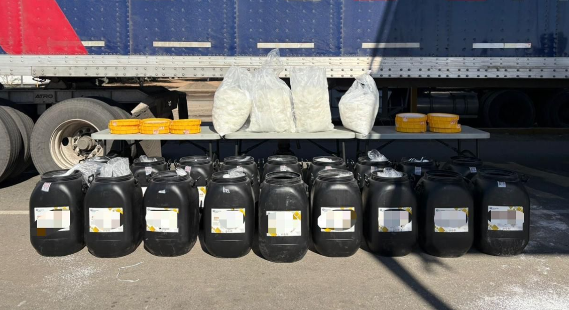Elementos de la Guardia Nacional y del Ejército Mexicano llevaron a cabo la inspección de un tractocamión marca freightliner, color blanco que circulaba de este a oeste con dirección a San Luis Río Colorado, mismo que al ser inspeccionado por medio de Rayos Gama se detectó una inconsistencia en la carga de la caja seca, por lo que se procedió a la verificación minuciosa, localizando en el interior 18 tambos color negro con la leyenda Dynclor Granular.