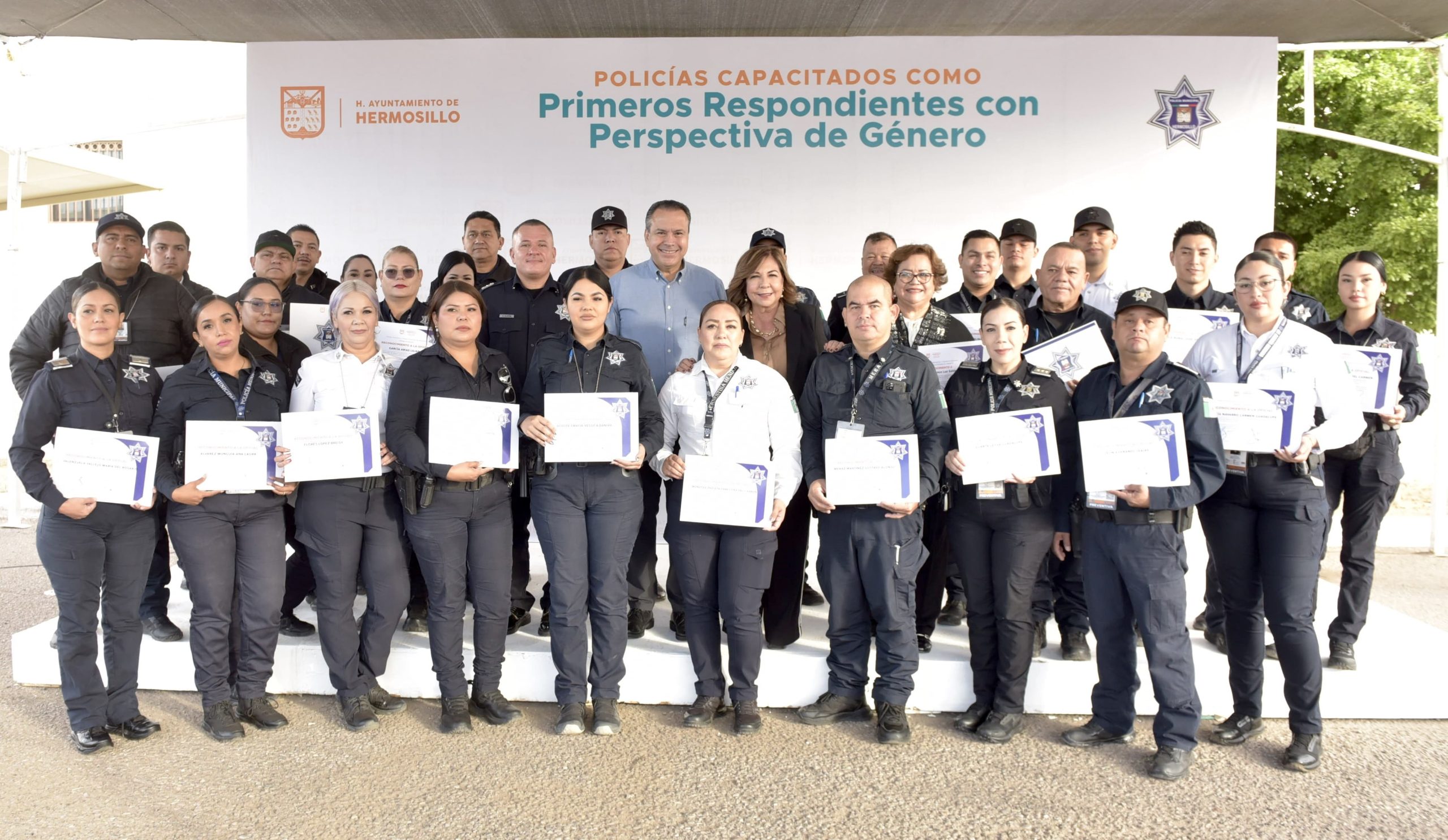 Acompañado por Alonso Durón Montaño, Comisario General de la Policía Preventiva y Tránsito Municipal y Angélica Payán García, directora de la Unidad de Género de la corporación, Toño Astiazarán entregó reconocimientos a quienes concluyeron su capacitación como Primeros Respondientes con Perspectiva de Género.