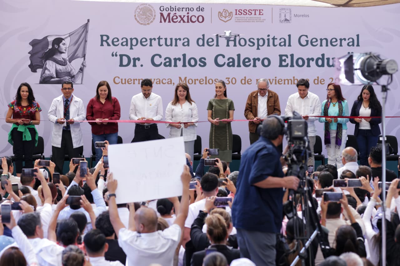 Cuernavaca, Morelos, a 30 de noviembre de 2025.- La Presidenta de México, Claudia Sheinbaum Pardo, y el director general del Instituto de Seguridad y Servicios Sociales de los Trabajadores del Estado (ISSSTE), Martí Batres Guadarrama, encabezaron la reapertura del Hospital General “Dr. Carlos Calero Elorduy”, ubicado en Cuernavaca, Morelos, que beneficiará a 157 mil 752 derechohabientes, luego de ser rehabilitado a petición de la comunidad.