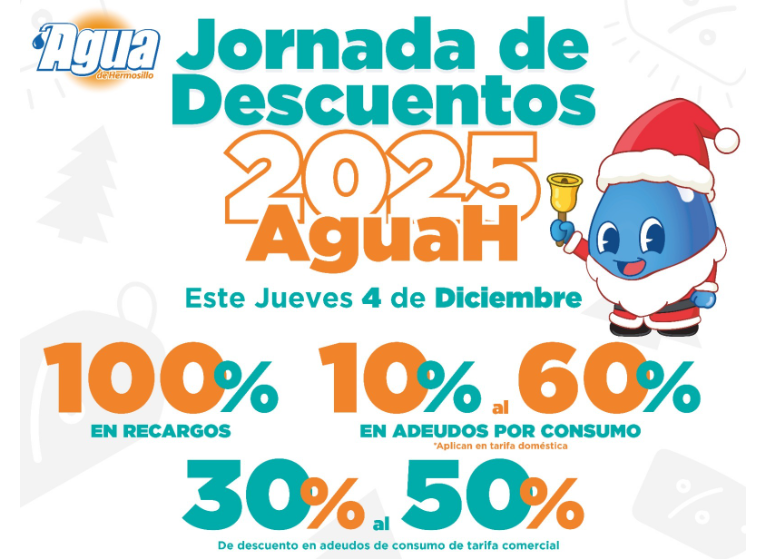 Hermosillo, Sonora a 02 de diciembre de 2025.- Agua de Hermosillo invita a todas y todos los usuarios a participar en la Jornada de Descuentos 2025, que se llevará a cabo este jueves 4 de diciembre, en la colonia Norberto Ortega, con el propósito de facilitar la regularización de adeudos.