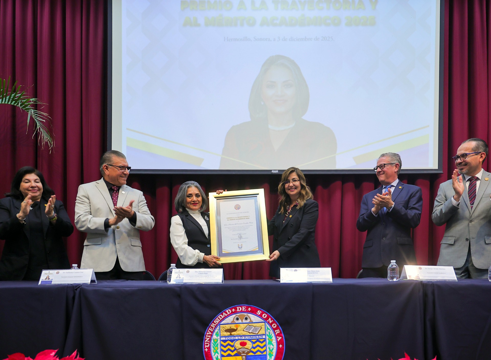 Hermosillo, Sonora a 04 de diciembre de 2025.- El Premio Universidad de Sonora a la Trayectoria y al Mérito Académico 2025 fue otorgado hoy a Maria del Carmen Candia Plata. Este máximo reconocimiento institucional distingue a quienes han contribuido de forma ejemplar al fortalecimiento académico a través de la docencia, la investigación y el servicio universitario.