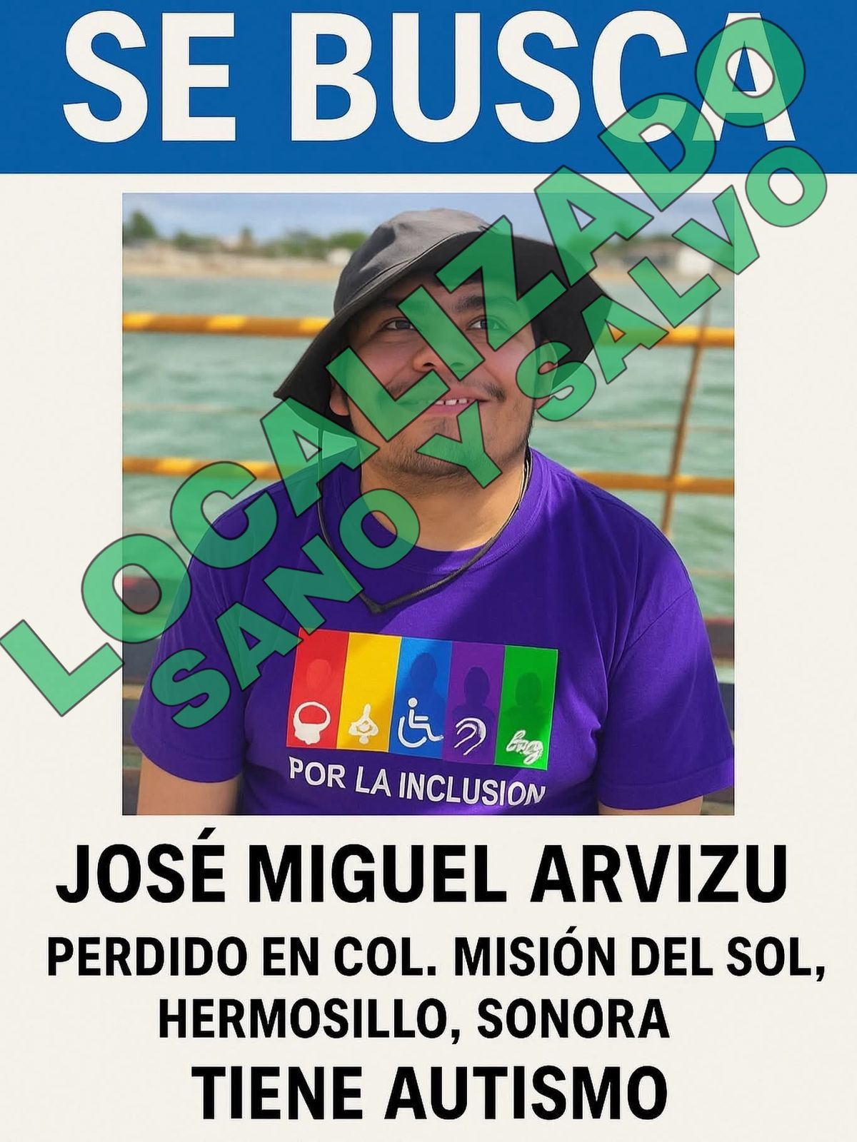 Hermosillo, Sonora, 7 de diciembre de 2025.- La Agencia Ministerial de Investigación Criminal (AMIC) informa que se localizó sano y a salvo a José Miguel, joven de 19 años con espectro autista, tras atender un reporte difundido en redes sociales que alertaba sobre su ausencia en Hermosillo.
