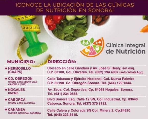 La Secretaría de Salud del Gobierno de Sonora recordó que cuenta con Clínicas de Nutrición en Hermosillo, Ciudad Obregón, Nogales, Caborca y Cananea, las cuales operan bajo un modelo integral que incluye trabajo social, consulta nutricional, atención médica y apoyo psicológico, y permanecen abiertas para brindar atención y acompañamiento especializado a la población interesada en mejorar su salud y bienestar integral.