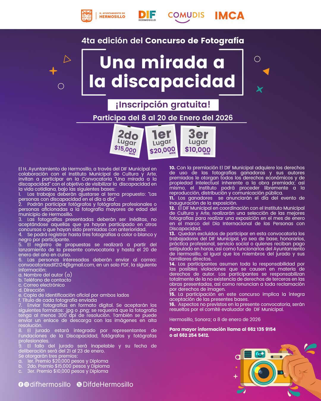 Hermosillo, Sonora a 12 de enero de 2026.- Hasta el 20 de enero es la fecha límite para registrarse en la cuarta edición del concurso de fotografía “Una Mirada a la Discapacidad”, informó Madeleine Bonnafoux Alcaraz, directora de DIF Hermosillo.