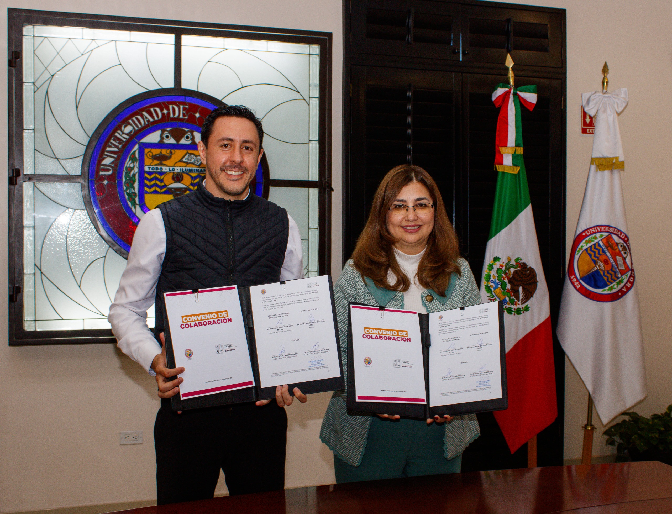 El acuerdo fue suscrito por la rectora, Dena María Camarena Gómez, y el secretario de Bienestar en Sonora, Fernando Rojo de la Vega Molina, quienes coincidieron en la importancia de articular el conocimiento universitario con las políticas públicas y los programas sociales para generar un impacto real y sostenible en las comunidades.