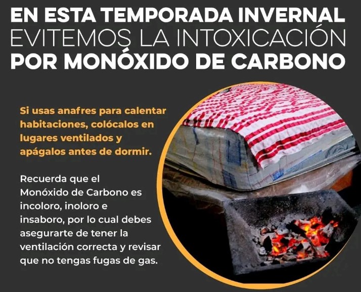 Durante la temporada invernal aumenta el riesgo de intoxicaciones por monóxido de carbono debido al uso inadecuado de calentones de gas, estufas de leña, anafres y fogatas dentro de los hogares, principalmente cuando no existe una ventilación adecuada.