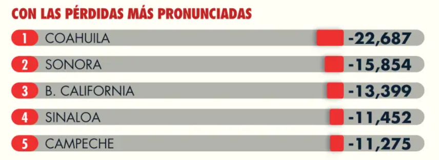 La lista la completaron Sonora, Baja California, Sinaloa y Campeche con las caídas más pronunciadas en la generación de empleo formal.