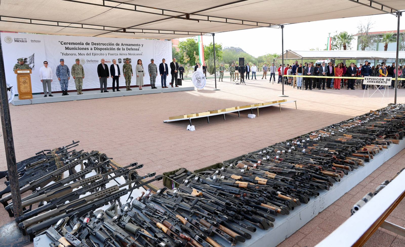 Hermosillo, Sonora; 16 de febrero de 2026.- Como resultado de acciones firmes de inteligencia interinstitucional para fortalecer la integridad de las y los sonorenses a través de la Mesa Estatal de Seguridad, el gobernador Alfonso Durazo Montaño encabezó la ceremonia de destrucción de armamento y municiones a disposición de la Secretaría de la Defensa Nacional (Sedena).