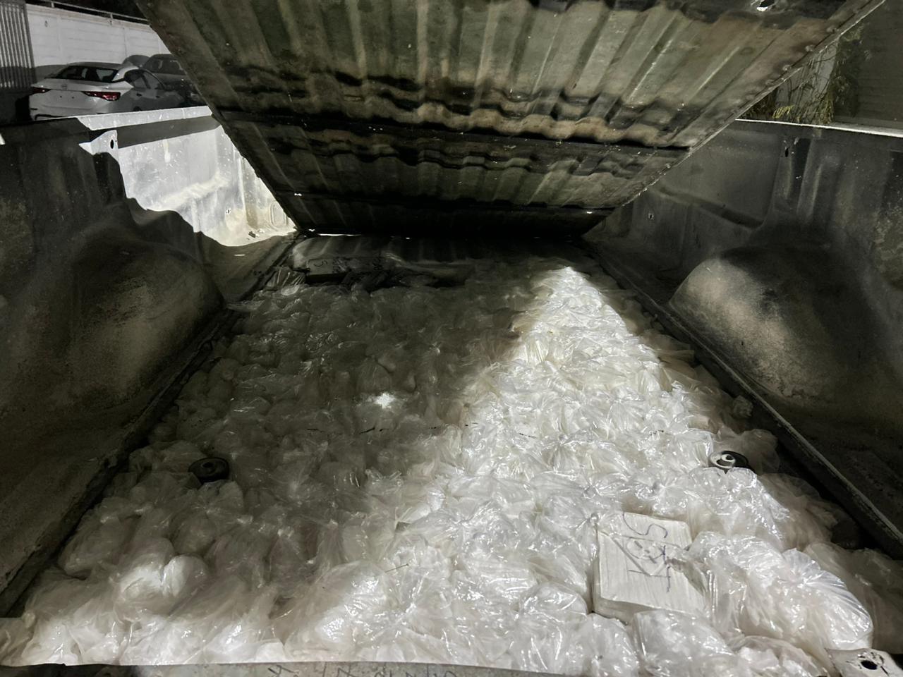 En el lugar se aseguraron 210 bolsas con una sustancia granulada similar a la metanfetamina, con un peso aproximado de 95.55 kilogramos. También se localizaron tres bolsas grandes con sustancia blanca a granel y 18 paquetes rectangulares con características de cocaína, con un peso total aproximado de 53.63 kilogramos.