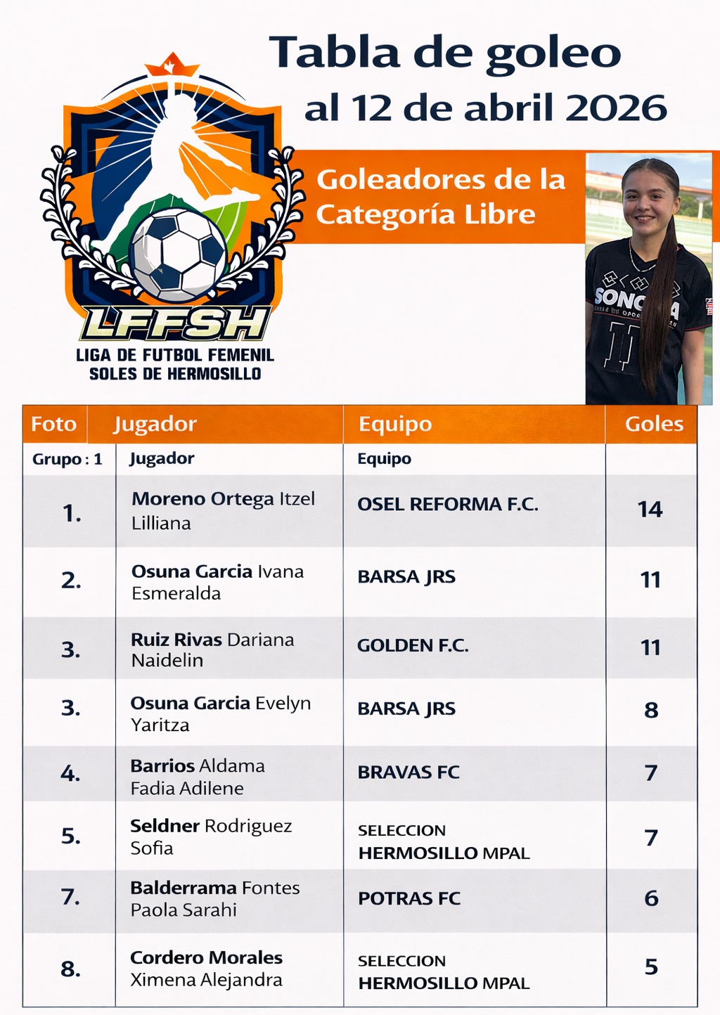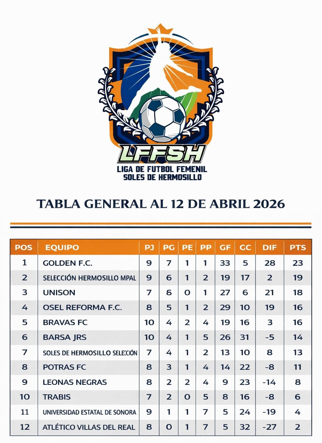Hermosillo; Sonora a 12 de abril de 2026.- La Liga de Futbol Femenil Soles de Hermosillo dio a conocer la actualización de sus estadísticas oficiales al 12 de abril de 2026, destacando el gran nivel competitivo que se ha desarrollado a lo largo de la presente temporada.