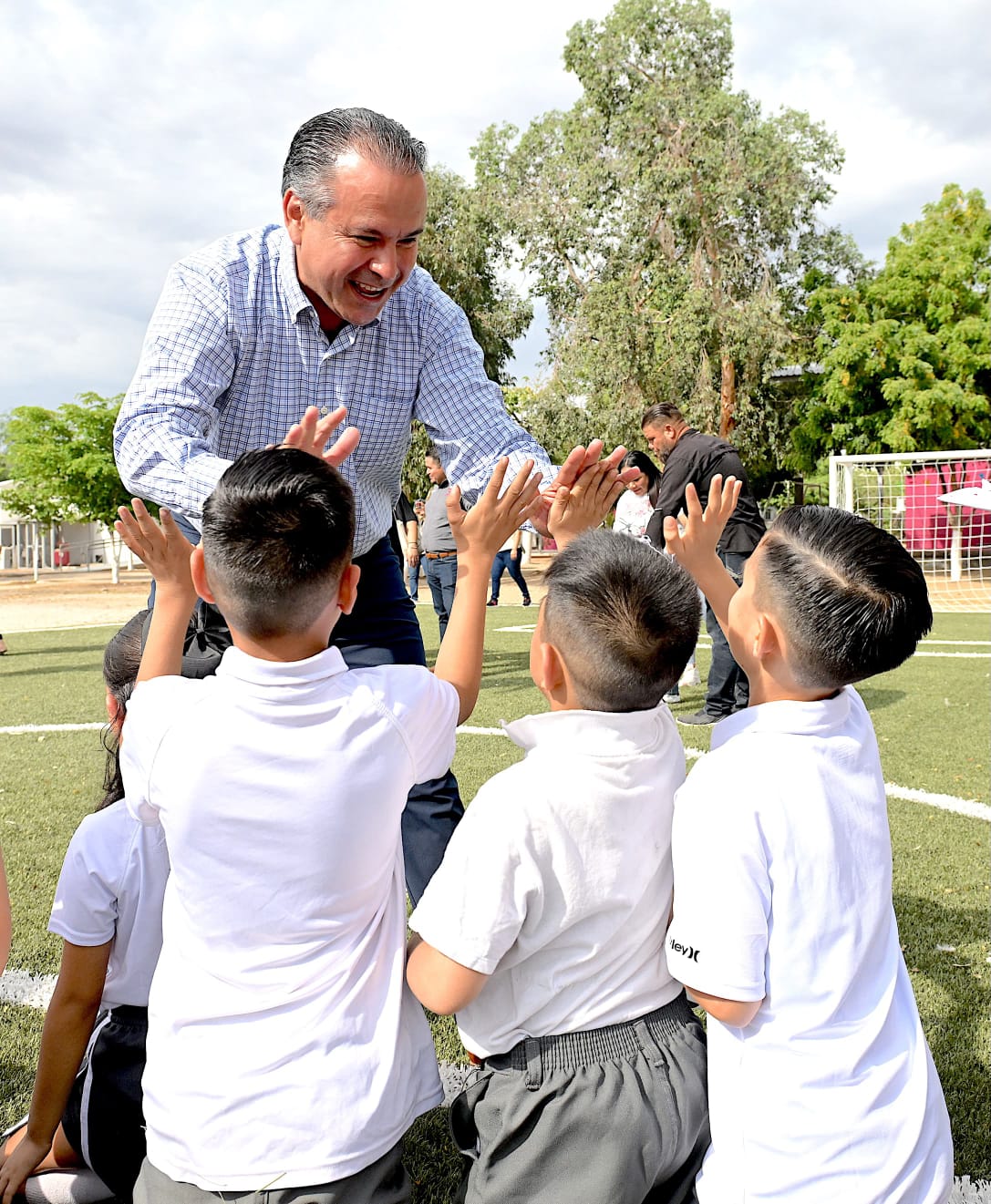 Entre aplausos y porras, el presidente municipal Antonio Astiazarán junto al niño José Alberto en la portería inauguró la cancha con el primer tiro de penal, despertando la emoción de estudiantes que celebraron con entusiasmo este nuevo espacio para el deporte.